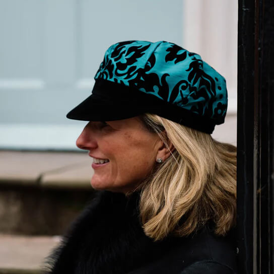 Meet Melanie, a baker boy cap designed to turn heads, whatever the weather. Crafted from eye-catching taffeta, the crown has a luminous, light-catching finish that shifts beautifully as you move, creating a subtle iridescent effect that brings colour and energy to even the greyest days.